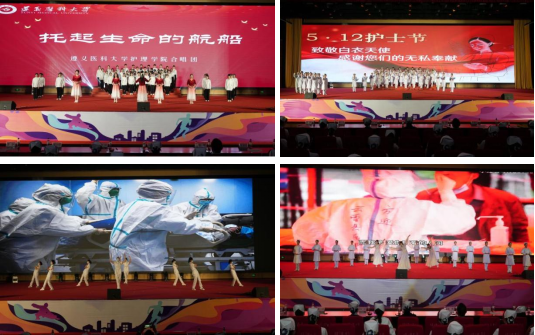展现·护生青春昂扬风采。 该篇以展现青年学子风采为主旋律,增进民族大团结的情感。伴随着炫彩的灯光、动感的音乐,由学生编排的舞蹈《追光者》在舞台中央精彩上演,拉开了文艺汇演的序幕;随后,《平凡的天使》《以舞抗疫》《致敬天使的赞歌》等歌舞表演精彩纷呈,歌颂了白衣天使舍生忘死、大爱无疆的奉献精神;《相亲相爱》民族舞串烧,以民族文化的演绎,描绘出民族团结一家亲的美丽画卷;最后,大合唱《托起生命的航船》把文艺汇演推向了高潮,唱出了对学校的爱与情,唱响了青年学子昂扬向上的奋斗之姿,充分展现了学院学生的青春激情与风采。