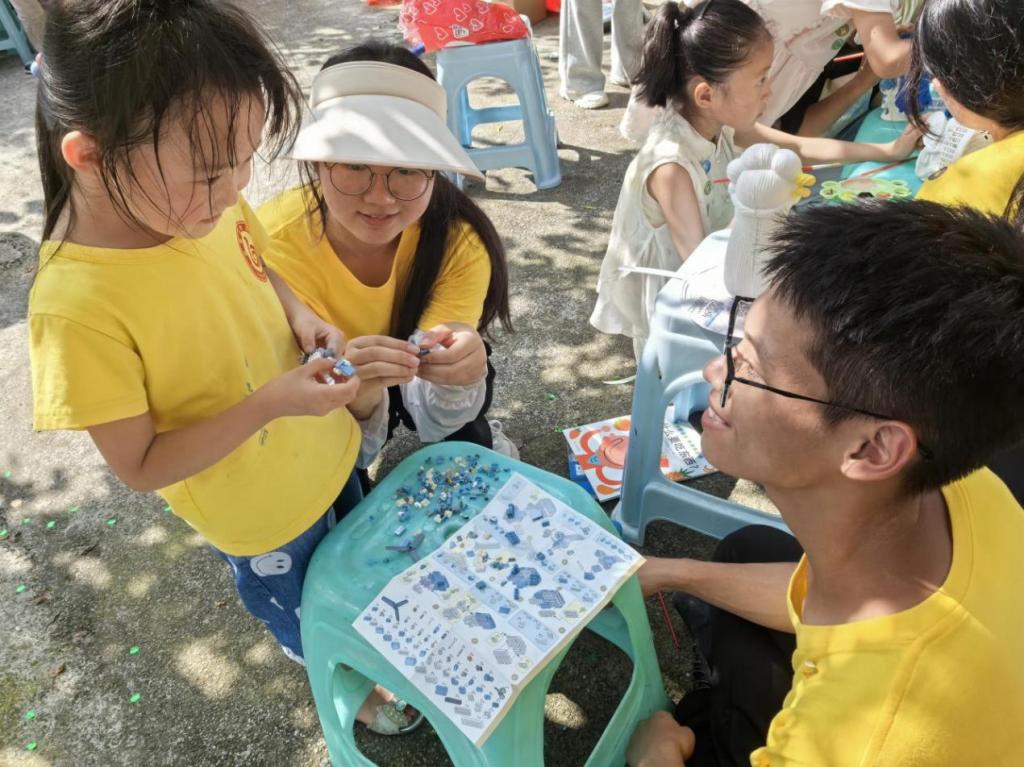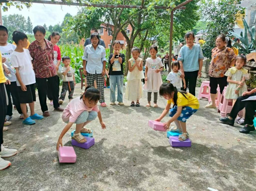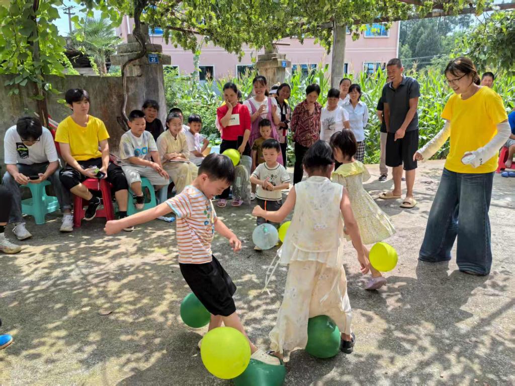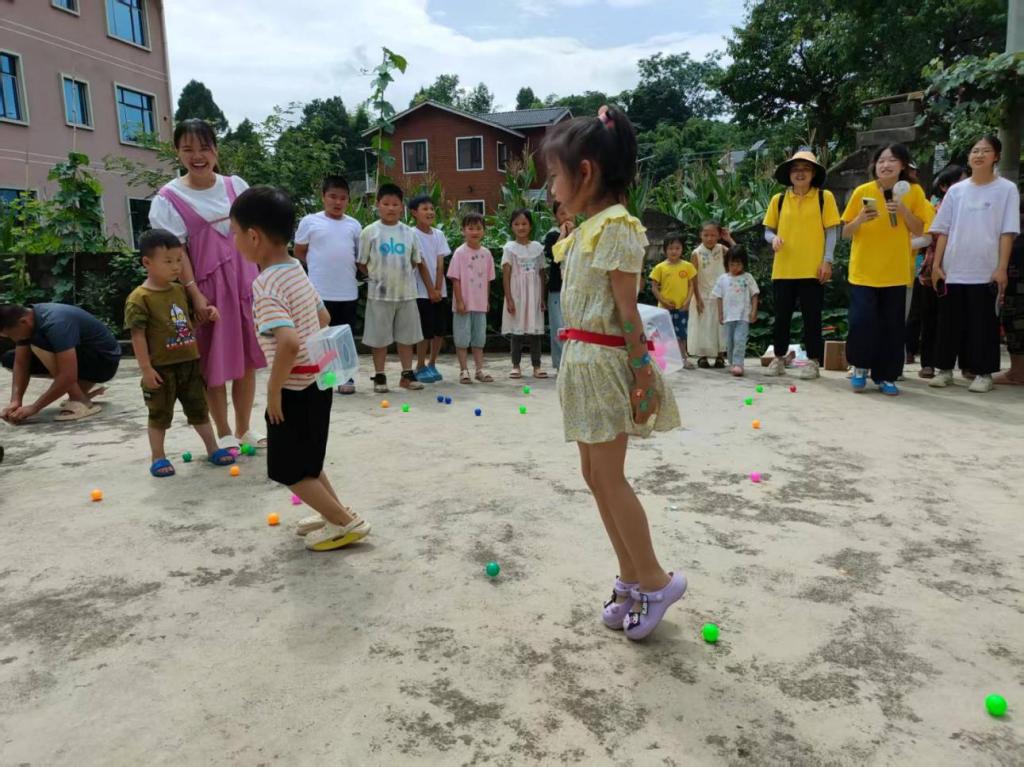 趣味运动竞技,绽放童真活力。“加油!加油!” 活动现场的呐喊声此起彼伏。实践队以分组比赛的形式,组织孩子们开展了 “摸着石头过河”“公鸡下蛋”“气球大作战” 等趣味运动。“摸着石头过河” 时,孩子们踩着纸板小心翼翼地向前挪动,小脸上写满专注;“公鸡下蛋” 环节,绑着球箱的小朋友们蹦蹦跳跳,努力让小球掉落,引得围观者阵阵欢笑;“气球大作战” 中,大家躲闪腾挪,生怕自己的气球被踩破…… 整个场地变成了欢乐的海洋,孩子们的笑声像银铃般清脆。获胜的小朋友捧着石膏娃娃、积木、科技小制作等奖品,开心地拉着队员们一起涂色、拼搭,分享胜利的喜悦。