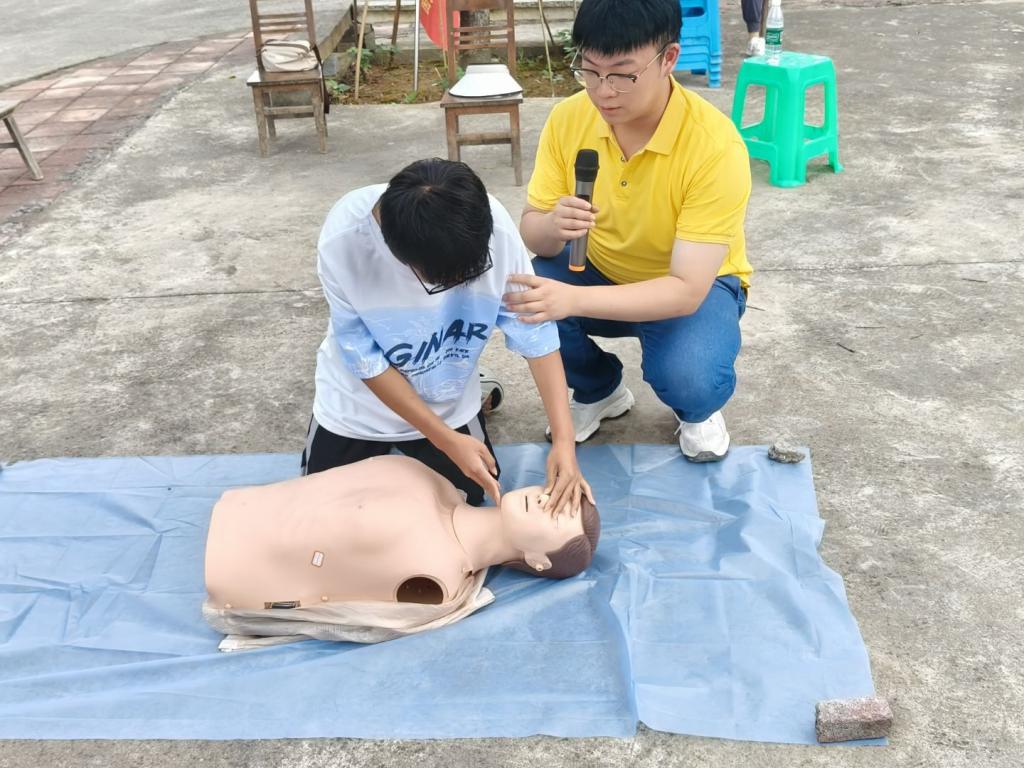 健康知识普及,护航儿童成长。“当有人被异物卡住喉咙,海姆立克急救法要这样操作……” 实践队的钟威老师一边演示,一边为在场的家长和小朋友们细致讲解海姆立克急救法、心肺复苏等实用急救技能。随后,进行实操练习,孩子们在老师的指导下,认真模仿按压手势,现场学习氛围浓厚。与此同时,队员们带着孩子们共读《身体大发现》《性别小常识》《不可思议的身体》等绘本书籍,通过趣味问答、情景模拟等方式,帮助孩子们认识身体构造、学习自我保护方法,助力儿童健康成长。