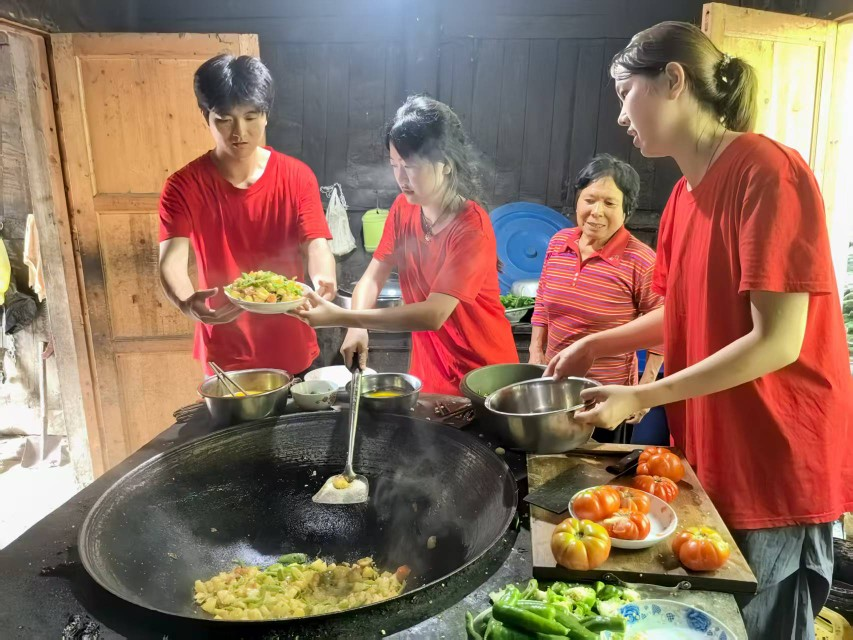 心系 “夕阳”,温暖相伴。实践队走进空巢老人和困境老人家中,与老人亲切拉家常,详细询问身体和生活状况,了解他们的困难。队员们为老人送上崭新的夏凉被,让老人在炎炎夏日感受到一丝清凉。在张奶奶家,队员们了解到,她不仅要照顾 87 岁的老母亲,还要照料双目失明的老伴,而儿子又常年在外务工。队员们主动帮忙打扫庭院,走进田间地头采摘新鲜蔬菜,化身 “贴心晚辈”,为老人一家做饭。大家围坐在一起,共享温馨时光,让老人感受到了家人般的温暖,脸上洋溢着幸福的笑容。