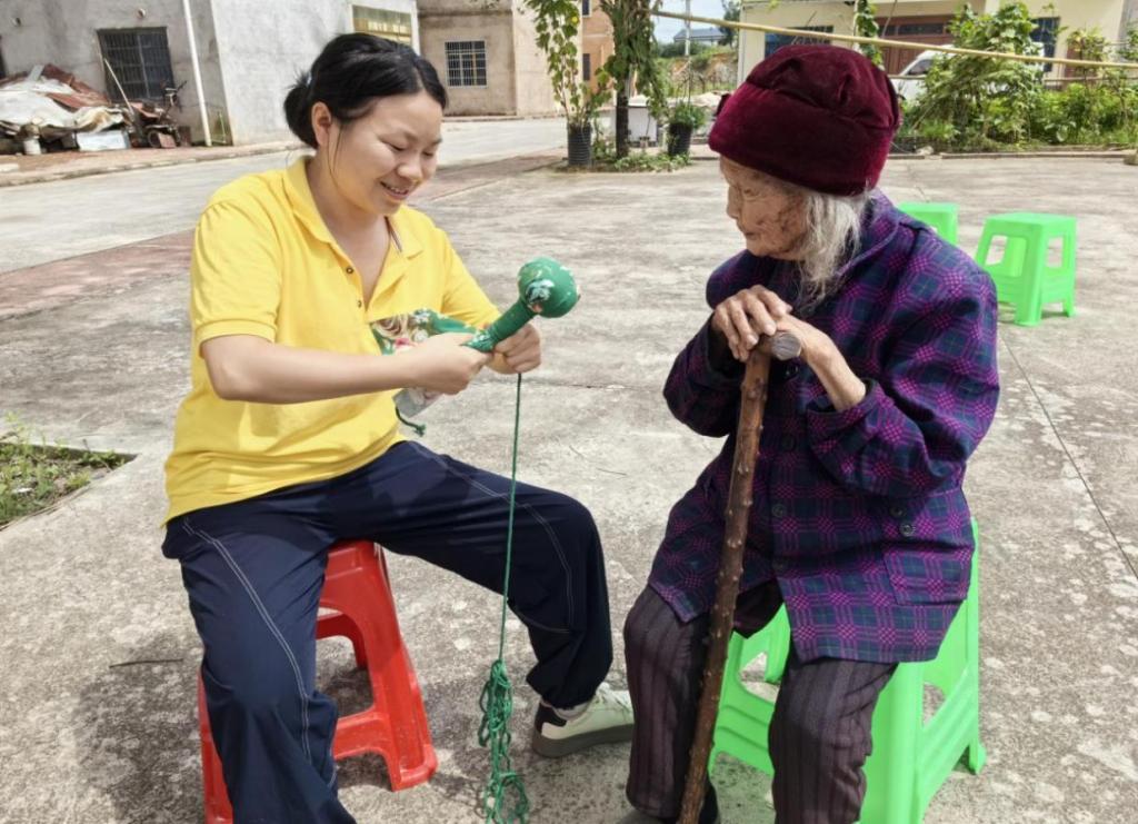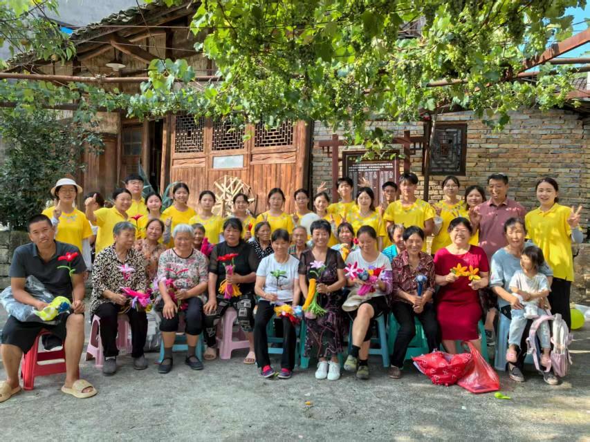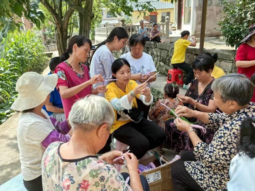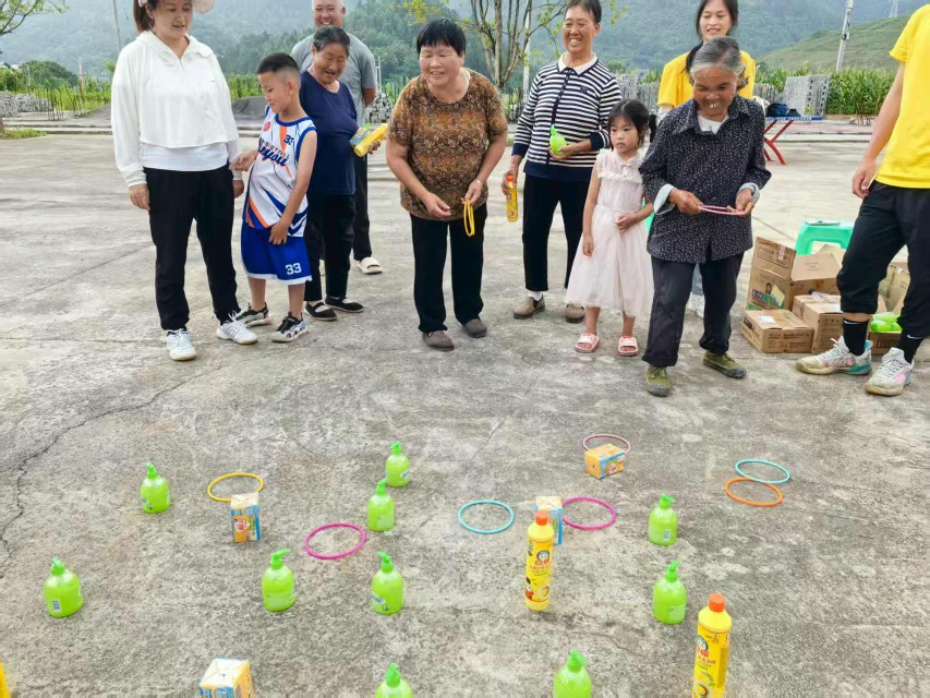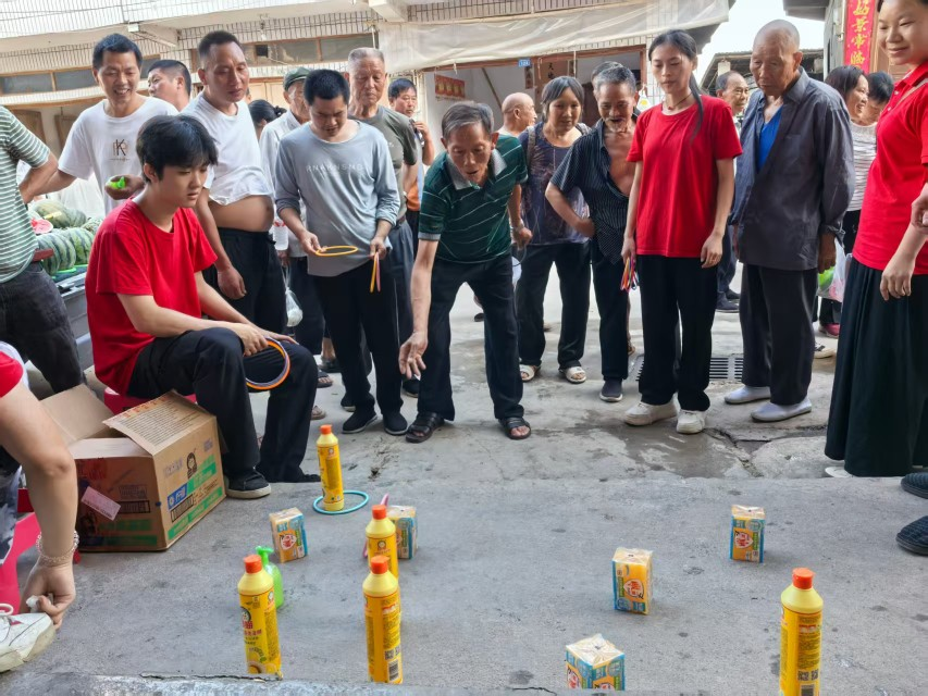 银发学技,乐在其中。队员们教老人们动手制作艾草养生锤,详细讲解其舒缓疲劳的功效,让老人能在闲暇时进行自我保健。还用色彩鲜艳的扭扭棒,手把手教老人制作栩栩如生的 “鲜花”,让老人把这份手作的快乐带回家。现场设置的趣味套圈游戏区更是热闹非凡,老人们积极参与,在欢声笑语中赢取了洗洁精、肥皂、洗手液等实用的日常生活用品。这些活动丰富了老人的精神文化生活,让深山里的院落充满了温馨与欢乐,传递着青年学子满满的关怀与陪伴。