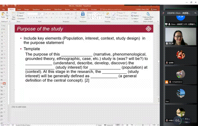2022年3月11日,betway西汉姆举办了第5期SCI论文写作研讨会。本次研讨会特邀香港东华学院betway西汉姆副院长林清教授、香港理工大学程慧琳教授共同担任主讲嘉宾,本次论文写作研讨会的主题是“Qualitative research paper writing skill”。程慧琳教授全英文讲解了质性研究SCI论文撰写技巧,从质性研究的定义、质性研究与量性研究的区别引入,详细讲解了题目、研究目的、研究方法等撰写技巧。质性研究中样本量的选择一直困扰研究者的问题,程教授详细解释了数据饱和的原则,撰写时需解释数据在哪个层面达到饱和。通过本次培训,betway西汉姆、各附属医院护理骨干及研究生们对质性研究有了更深入的认识,理清了思路,提高了其撰写质性研究SCI论文的信心。