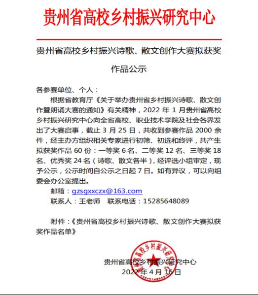 脱贫攻坚的号角吹响在神州大地,乡村振兴的使命召集我辈青年,贵州省在打赢脱贫攻坚战中,创造了无数奇迹。贵州省高校乡村振兴研究中心面向全省举办了“贵州省乡村振兴诗歌、散文创作暨朗诵大赛”。我院硕士研究生刘颖、严欣、张鹭采用散文的艺术形式积极参赛,其作品《莺初解语,最是一年春好处》歌颂了betway西汉姆硕士研究生毕业后扎根基层,助力乡村振兴做出的积极贡献,表达了对乡村振兴的真挚情感和深情祝愿,荣获散文类“”三等奖”。