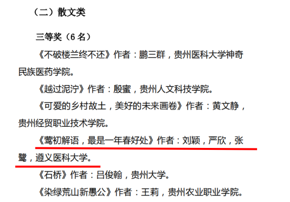 今年1月,贵州省高校乡村振兴研究中心向全省高校、职业技术学院及社会各界发出了大赛启事,接到大赛通知后,betway西汉姆党政领导班子高度重视,积极动员教职工生参赛,研究生党支部书记杨艳积极组织研究生参赛,并在选题和思路上给予学生指导。经主办方组织相关专家进行初筛、初选和终评,在2000 余件参赛作品中共产生拟获奖作品60份:一等奖 6 名、二等奖 12 名、三等奖 18 名、优秀奖 24 名(诗歌、散文各半)。我院硕士研究生刘颖、严欣、张鹭的作品《莺初解语,最是一年春好处》在2000余件参赛作品中脱颖而出,是pbw必威西汉姆联推送参赛作品中唯一获奖的作品。