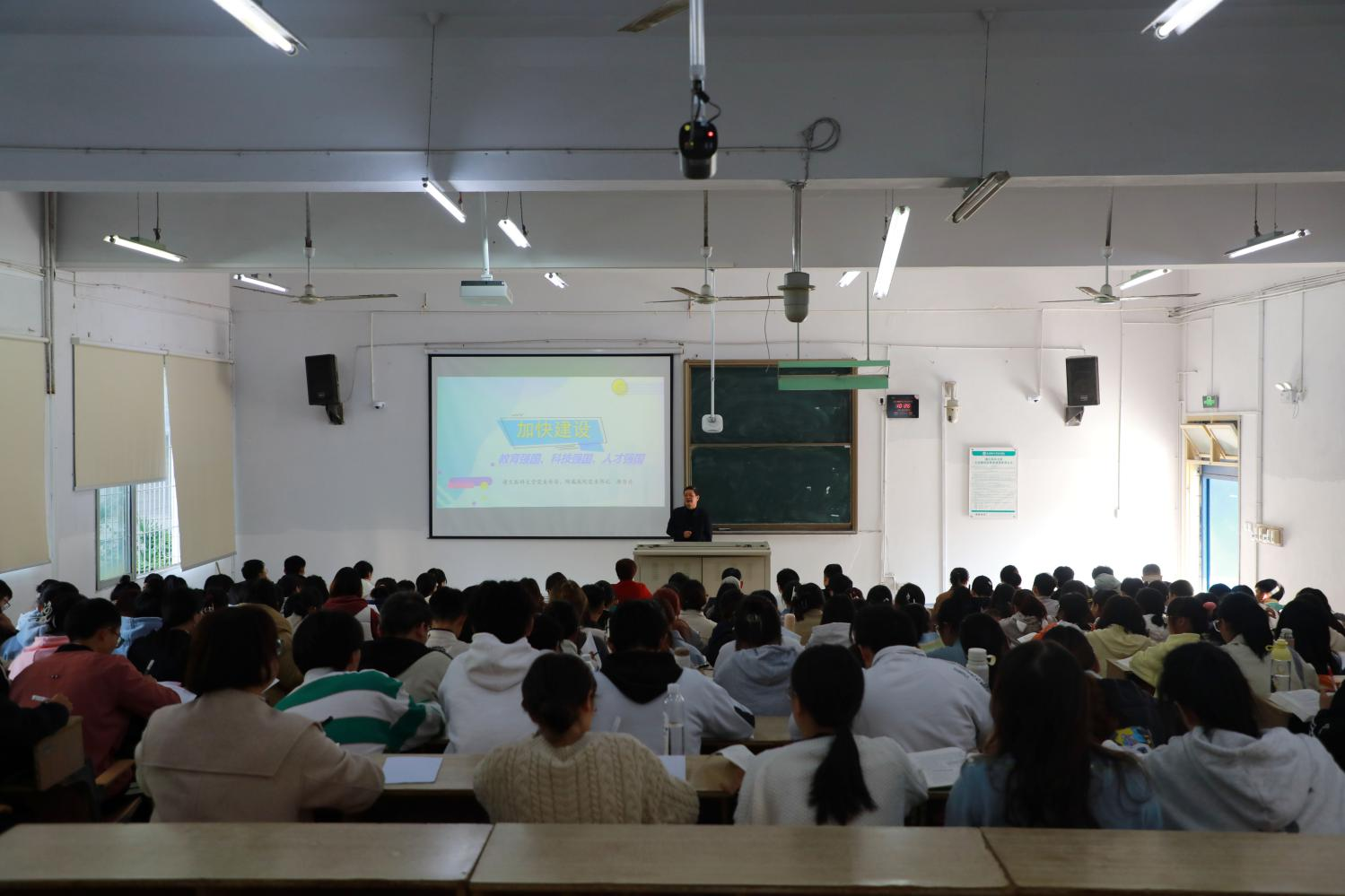 唐自力以“加快建设教育强国、科技强国、人才强国”为题,分别围绕“着眼长远发展的重大抉择”“铸就强国建设的坚实基础”“加快强国建设的战略部署”“充分发挥高校的重要作用”四个方面,结合中国近现代史与建党百年的辉煌成就,用极富感染力的语言给同学们讲解了将教育、科技、人才三者系统谋划、共同服务于创新型国家建设、在强国建设过程中的重要作用。