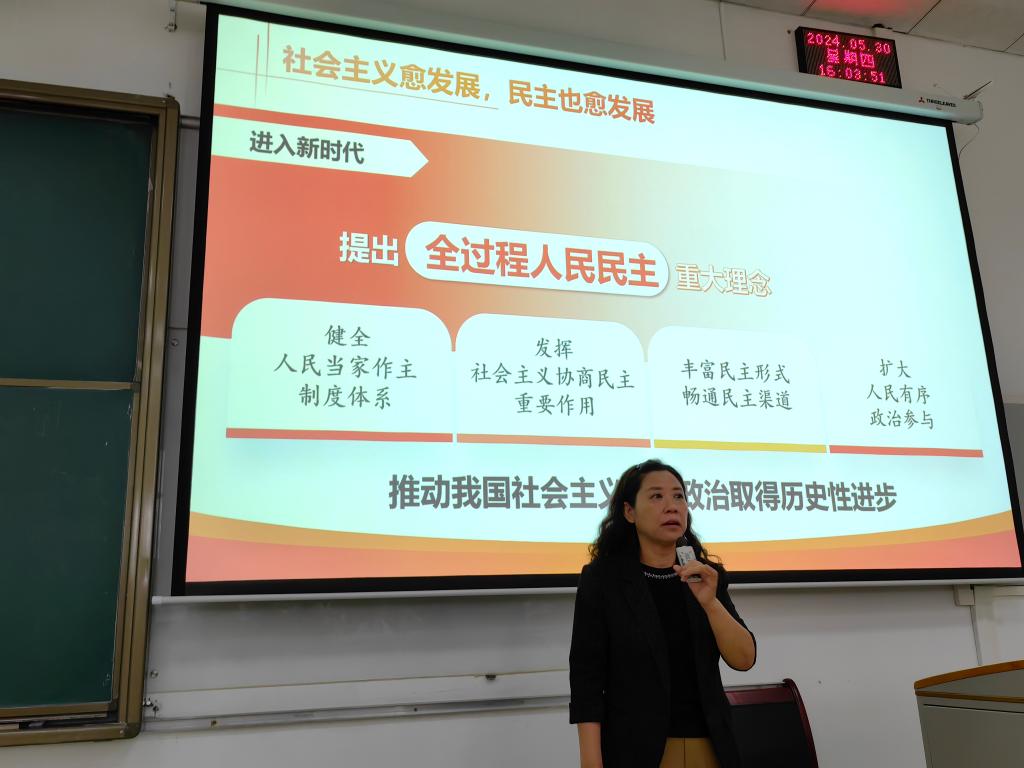 党委书记张咏梅走进学院2023级护理1-4班课堂,以《全面认识全过程人民民主》为主题,分别从“越走越宽的民主之路”“科学有效的制度安排”“彰显优势的民主模式”“可资借鉴的民主典范”四个方面给学生作了讲解。她强调,全过程人民民主是中国式民主长期发展、 不断完善、内生性演化的产物,符合我国国情、适应时代要求、体现人民意志,是最广泛、最真实、最管用的社会主义民主,并希望同学们要理解和参与全过程人民民主,增强公民意识,做合格公民,为构建更公正、平等和民主的社会作出贡献。