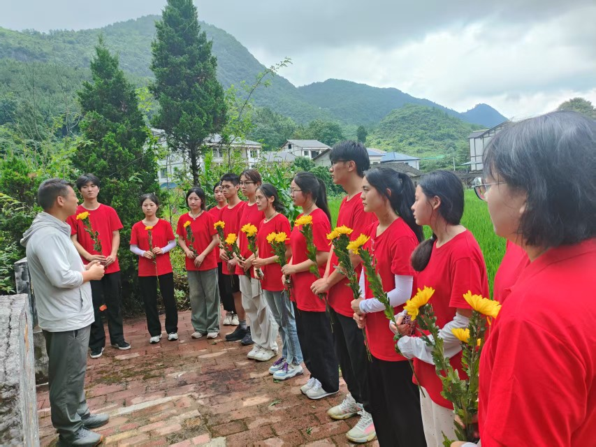 在平溪村埃山历史文化陈列室,平溪村第一书记黄勇向大家介绍了平溪村的由来、自然风光、风土人情以及近年来平溪村挖掘红色资源赋能乡村振兴的发展历程。参与埃山历史文化陈列室建设的村民胡佐国向师生一行介绍了罗君彝、罗俸宽、胡畏等革命志士为革命事业作出突出贡献、献出宝贵生命的感人故事。随后,师生一行来到革命烈士罗俸宽墓,向长眠于此的英魂敬献黄菊,革命志士为革命事业抛头颅洒热血的崇高精神,深深烙印在队员心中。