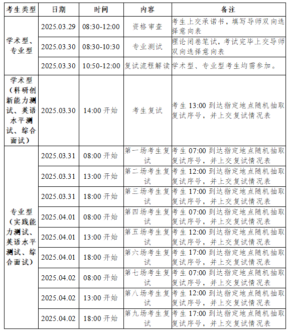 复试实行学术型和专业型考生分类选拔。学术型重点考核考生的学术素养、对学科知识掌握与运用情况、科研创新能力,专业型重点考核考生的专业基础、实践能力和职业素养。复试安排见表1:复试流程表。