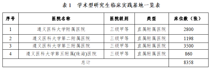 学位点为国家一流本科专业建设点、贵州省重点学科,拥有国家级虚拟仿真实验教学中心及国家级临床技能实验教学示范中心各1个,国家级临床重点专科10个(其中护理学国家临床重点专科1个)、护理学创客空间1个、学校医学大数据研究中心1个;共享学校教育部重点实验室1个(基础药理教育部重点实验室)、省级重点实验室3个,附属医院国家临床研究中心分中心3个、国家级生物样本库1个、公共实验室平台1个;学位点的4家临床实践基地均为三级甲等医院(见表1)。